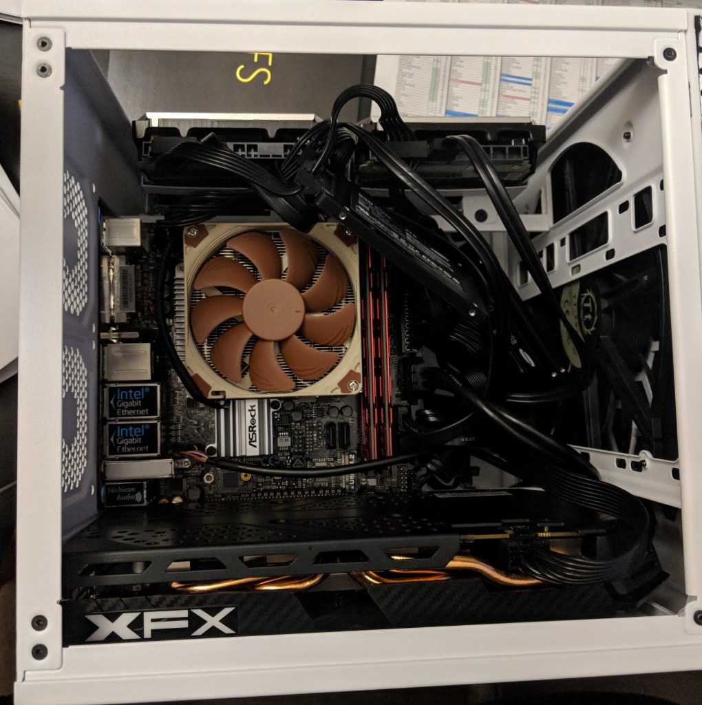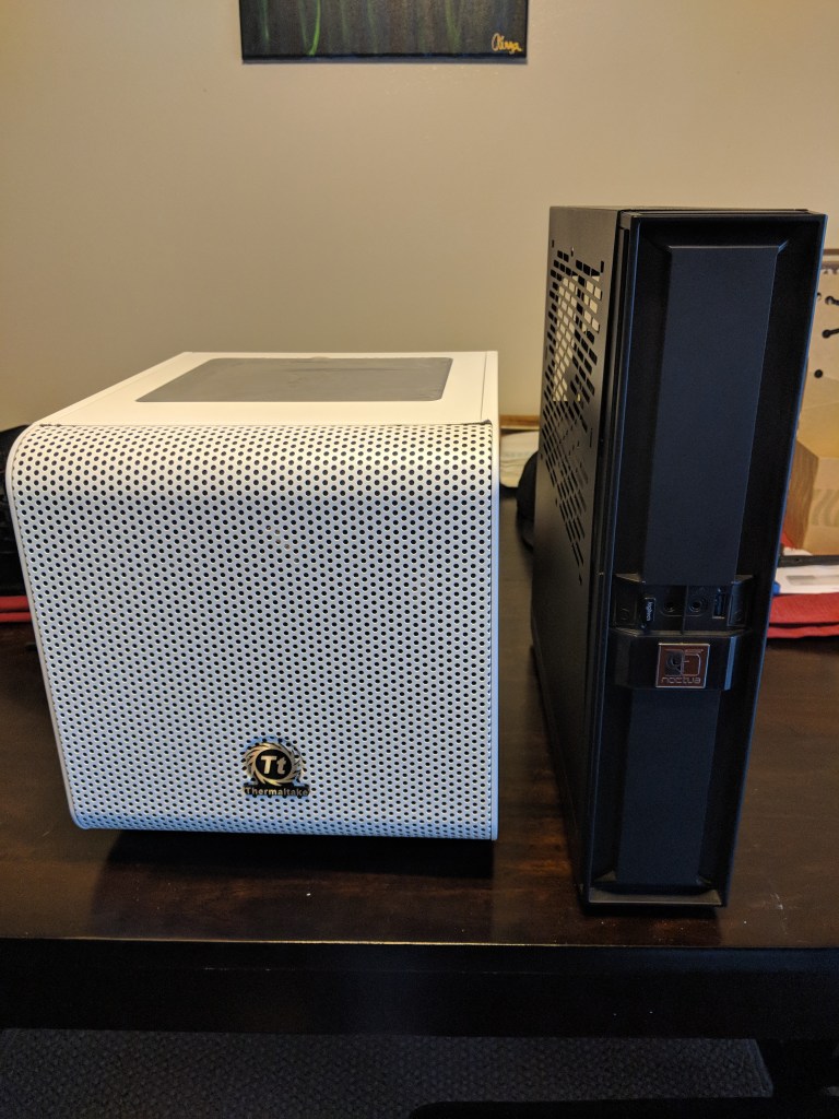 Another computer shares my normal battlestation space, and that’s the Unreliable LAN Box. It started out as a travel PC that would crash randomly (found out later it was a faulty PCIe riser in the original case I was using), and eventually became a Plex/home server. The final specs are include a Pentium G4560 (very capable little chip – 3.5 GHz CPU with hyper threading for $60?! Slam dunk.), an RX 580 then a GTX 1070, and 16tb in RAID 1. I use it to primarily serve my Plex media to my home theater and occasionally for remote access, and for providing easy file sharing across my network.